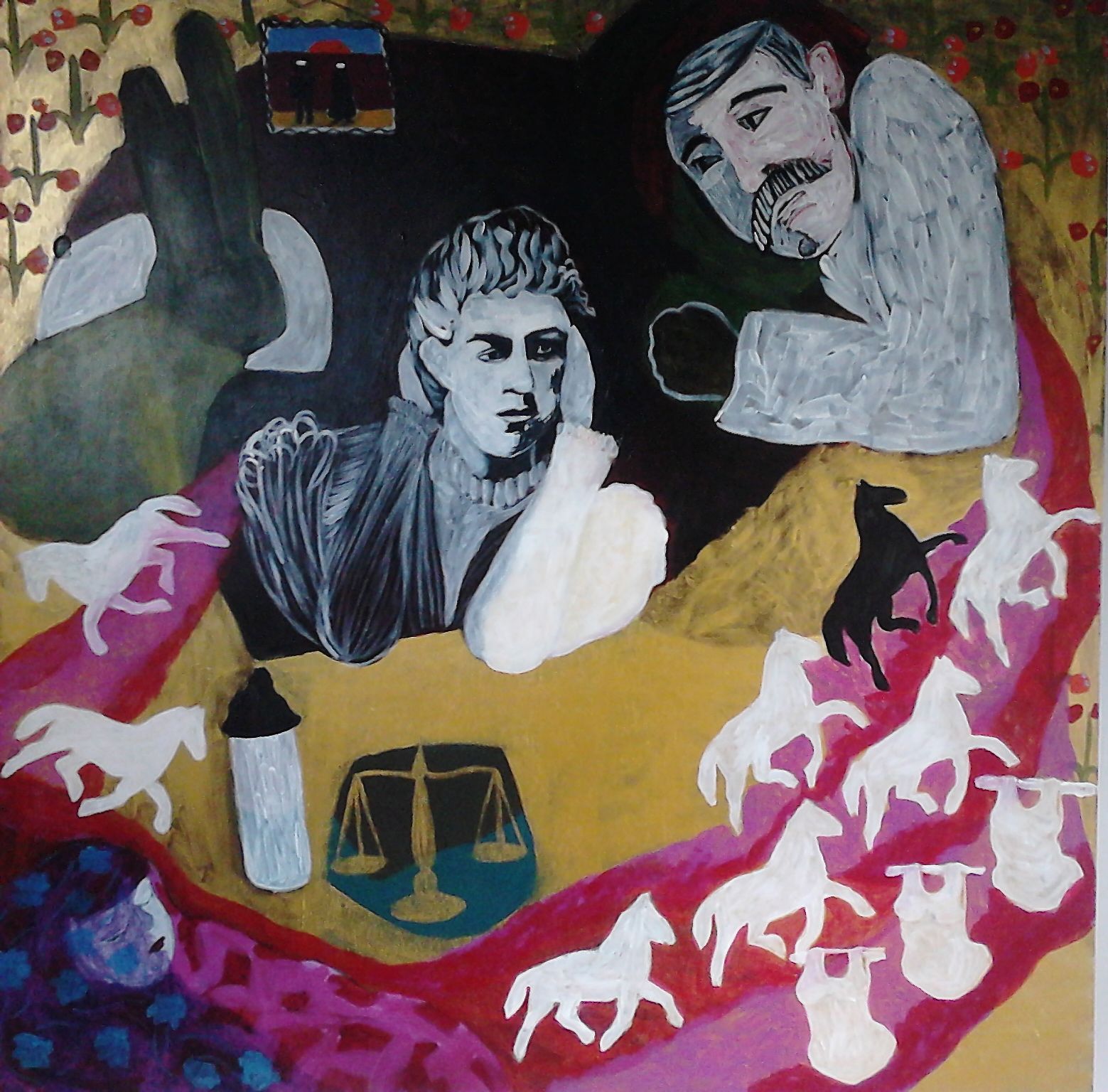 Wilson’s larger landscape paintings depict crucial events in the Kelly saga, as well as intimate daily scenes. The broader settings include goldfields, maps of the town of Glenrowan where Ned Kelly was ambushed, Cadow Station near Forbes superimposed with ancestral faces, and Kate breaking-in colts, or riding a horse through bushland as a decoy for the police. Wilson portrays images with highly charged emotions. We see the dubious joy of Kate’s wedding day to “Bricky”, Kate visiting the Governor to ask for mercy for Ned, the death of her sister Maggie, and the corpse of Kate floating in the lake.